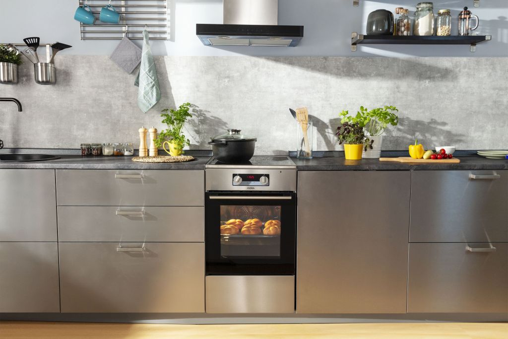 v striebornej farbe má plynovú varnú platňu a veľkú multifunkčnú rúru s objemom 70 l aj pri šírke 50 cm. Plynové horáky s poistkami proti zhasnutiu plameňa a integrovaným zapaľovaním sú kryté dvojdielnou stabilnou liatinovou mriežkou, ktorá umožňuje bezpečné presúvanie riadu vo všetkých smeroch. Rúra pečie dokonale rovnomerne vďaka inovatívnemu patentovanému klenutému vnútornému priestoru s novou konštrukciou a novým umiestnením výhrevných telies a ventilačných otvorov. Je vybavená 11 programami na pečenie a pôsobivým teplotným rozsahom 50 – 275 °C. Vyčarujete v nej napríklad výbornú pizzu ako z talianskej reštaurácie (program Pizza), pomaly upečiete pečienku a rýchlo rozmrazíte hotové porcie jedla. Má tiež dva parné programy – stačí naliať asi 2 dcl vody do plytkého pekáča a vybrať príslušný program. Ak máte radi hranolky alebo kuracie nugetky, ale nedoprajete si ich tak často pre ich vysokú kalorickú hodnotu, môžete vyskúšať aj program teplovzdušnej fritézy bez tuku. Jedinečný je špeciálny program na prípravu mrazených jedál alebo rozpekanie mrazeného pečiva bez nutnosti predhrievania rúry. V prípade potreby sa však rúra predhreje na 200˚C za rekordne krátky čas (menej ako 5 minút). Poteší vás tiché zatváranie dvierok rúry a teleskopický výsuv na bezpečnú manipuláciu s pripravovaným jedlom bez toho, aby ste ho museli vyberať z rúry. V spodnej časti sporáka sa nachádza praktický úložný priestor, do ktorého ľahko uložíte príslušenstvo, ako je napríklad rošt, plytký plech a XXL pekáč s objemom 8 litrov. Funkcia EcoClean zabezpečuje dokonalé vyčistenie vnútorného priestoru po každom pečení bez potreby použitia čistiaceho prostriedku. Stojí 429 EUR.